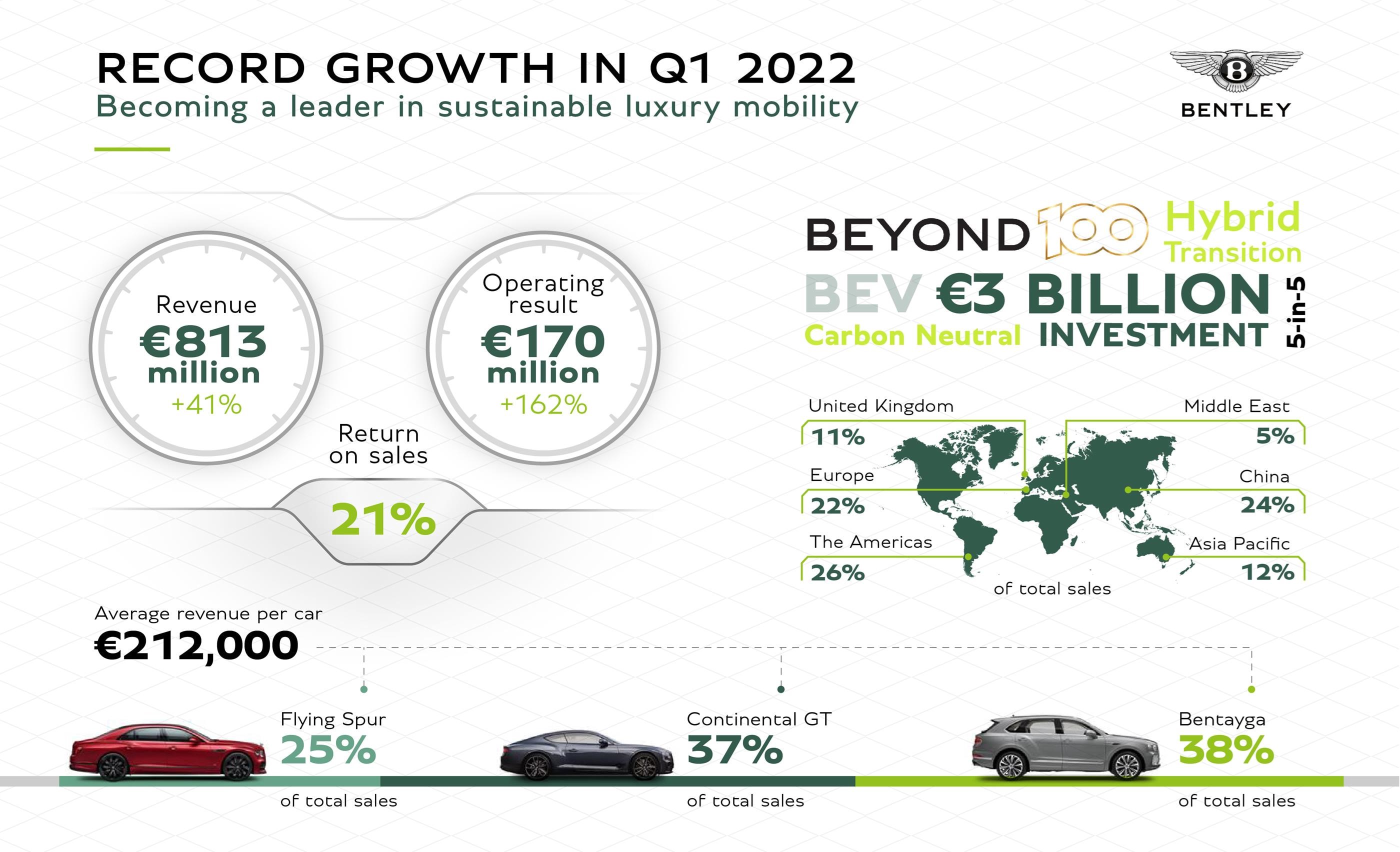 Bentley Motors today announced record financial results for the first quarter of 2022. The encouraging figures reveal an unparalleled performance by the luxury British marque across the first three months of a year, with operating profits up 162 per cent to €170 million, mirroring the company’s second highest full-year profit figure ever.