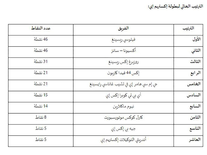 وبهذه النتيجة، تصدر فريق “فيلوسي ريسينغ” الترتيب العام بعد انتهاء الجولة الأولى لسلسلة إكستريم إي، وذلك برصيد 46 نقطة، تلاه فريق “أكسيونا سانز إكس إي” في المركز الثاني بنفس الرصيد، ومن ثم فريق “روزبرغ إكس” في المرتبة الثالثة برصيد 31 نقطة، فيما حلّ فريق “إكس 44 فيدا كاربون” في المركز الرابع برصيد 21 نقطة، ومن خلفهم فريق “جي إم سي هامر إي في تشيب غاناسي رايسينغ” والذي استطاع تسجيل اسمه في المركز الخامس، برصيد 21 نقطة.
