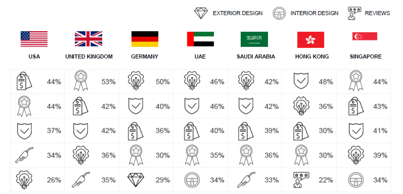 أظهر المستهلكون بالمملكة العربية السعودية ودولة الإمارات وعيًا كبيرًا بالعوامل المؤثرة في قرارات الشراء. وتشمل أبرز هذه العوامل: السلامة، التكنولوجيا المتطورة، الاعتمادية، كفاءة استهلاك الوقود، والسعر. وتُعد التجهيزات الحديثة للسيارات مقابل أسعار مناسبة على رأس أولويات المستهلكين في هذه الأسواق، وهو ما يتوافق مع المزايا التنافسية التي تقدمها السيارات الصينية. ومع ذلك، تبقى الاعتمادية أحد المخاوف الرئيسية، خاصة بين المستهلكين في دولة الإمارات. أهم 5 معايير لاختيار السيارة المناسبة حسب السوق
